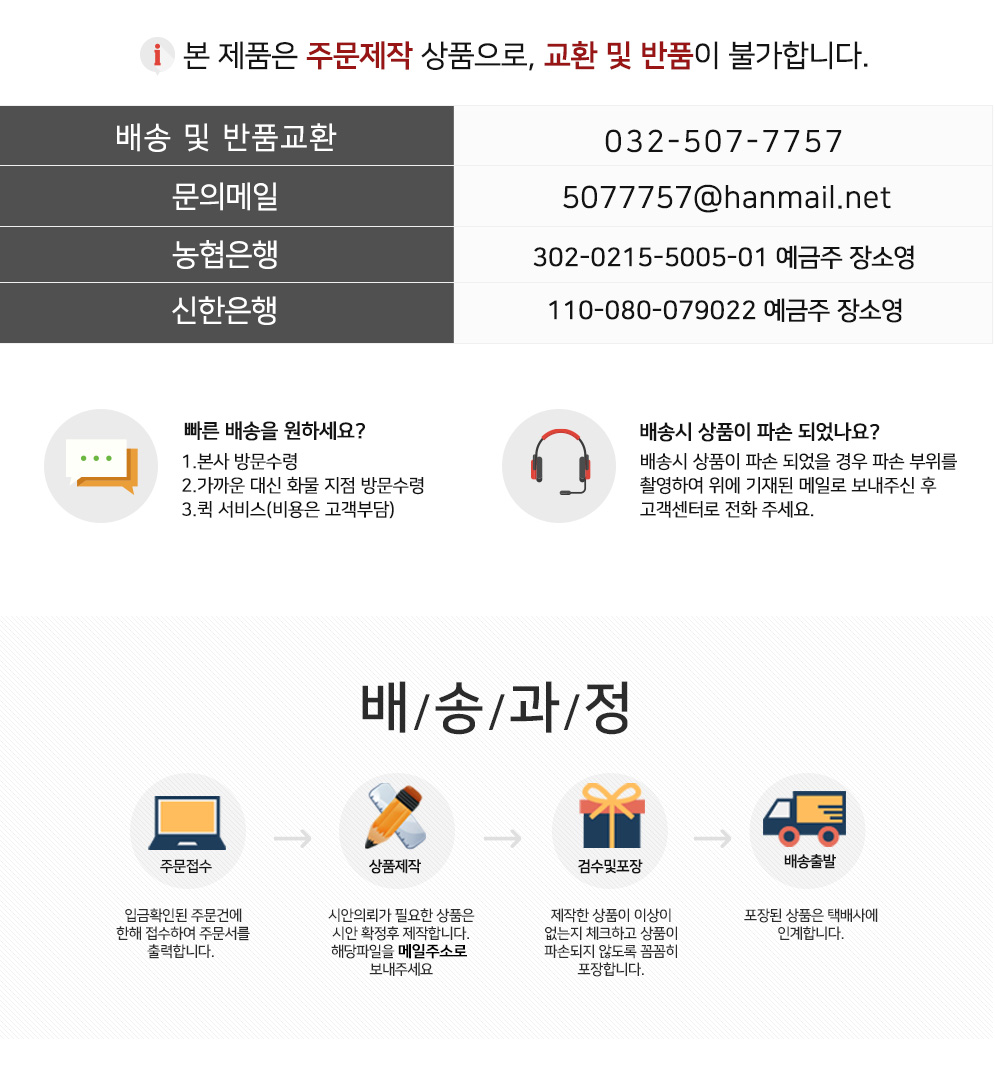 -디자인변경, 주문제작의 경우 제품종류와 수량에 따라 제작/배송기간이 다르니 별도로 문의하시기 바랍니다. |